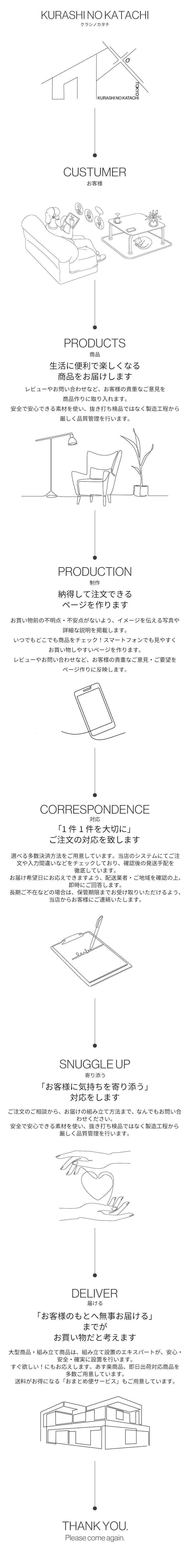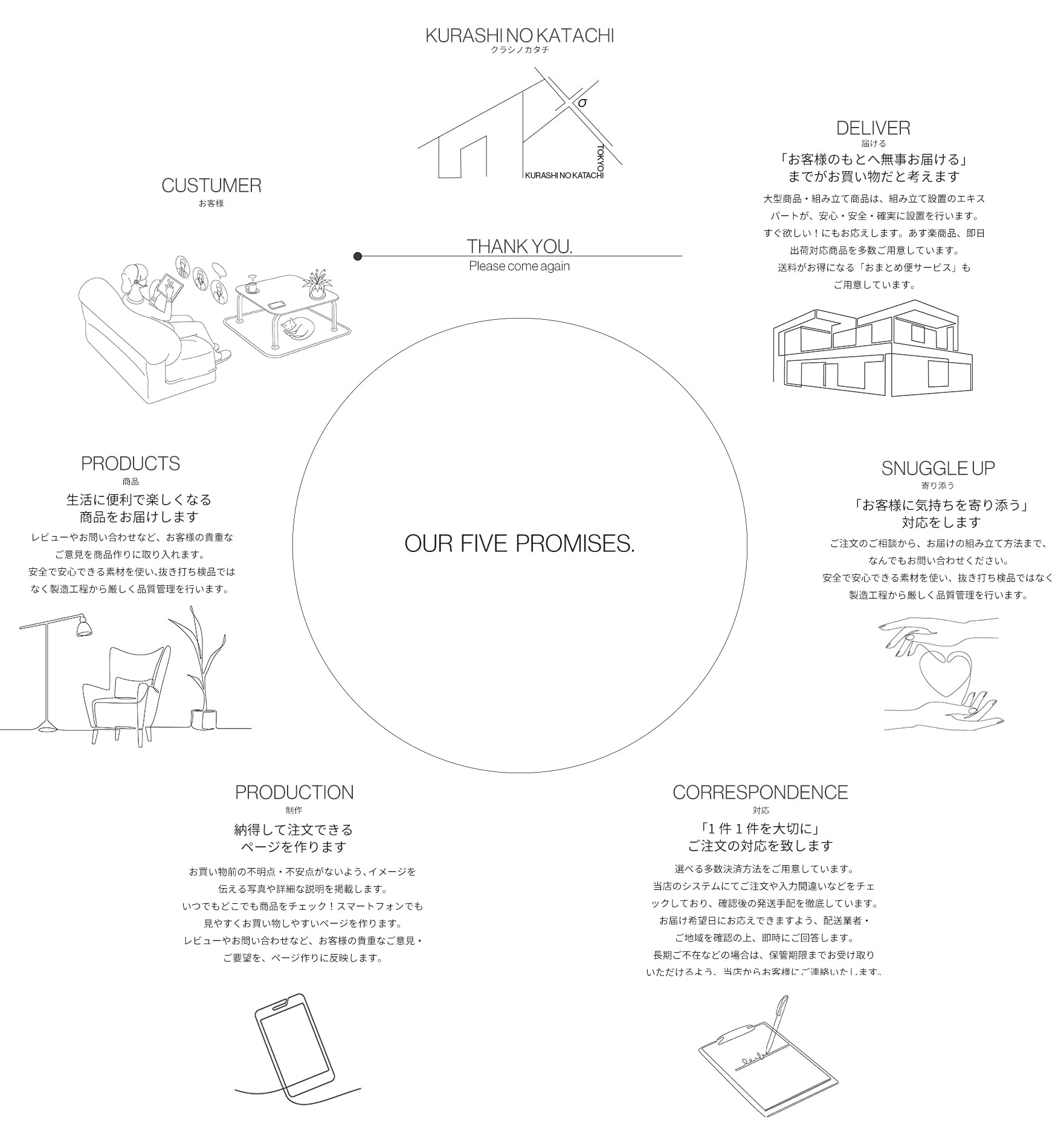「お客様への5つのお約束」を掲げて、ご購入者様に満足していただける新しい商品やサービスを常に探求し、ご提供していきます。