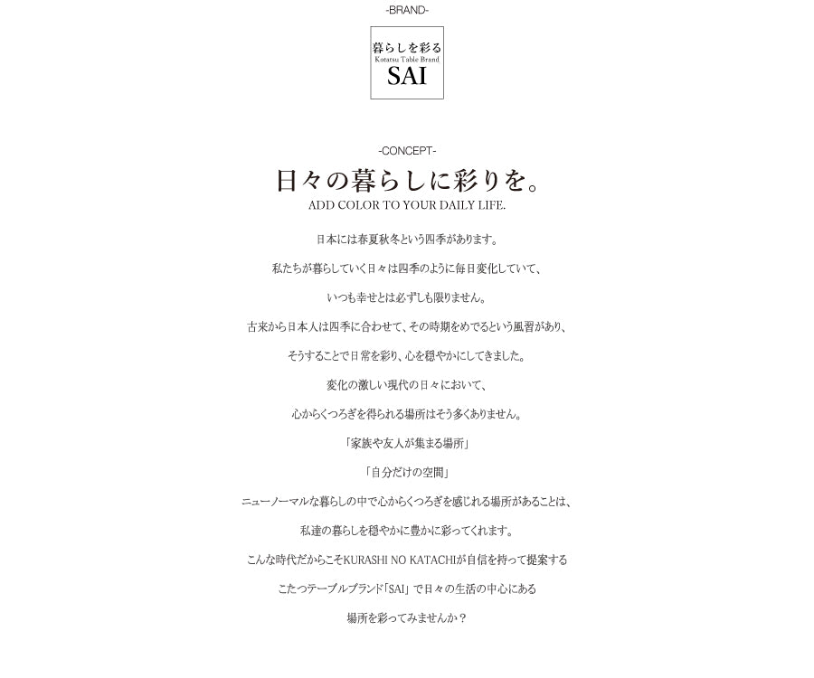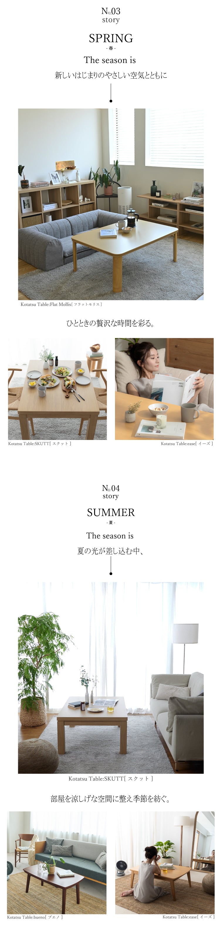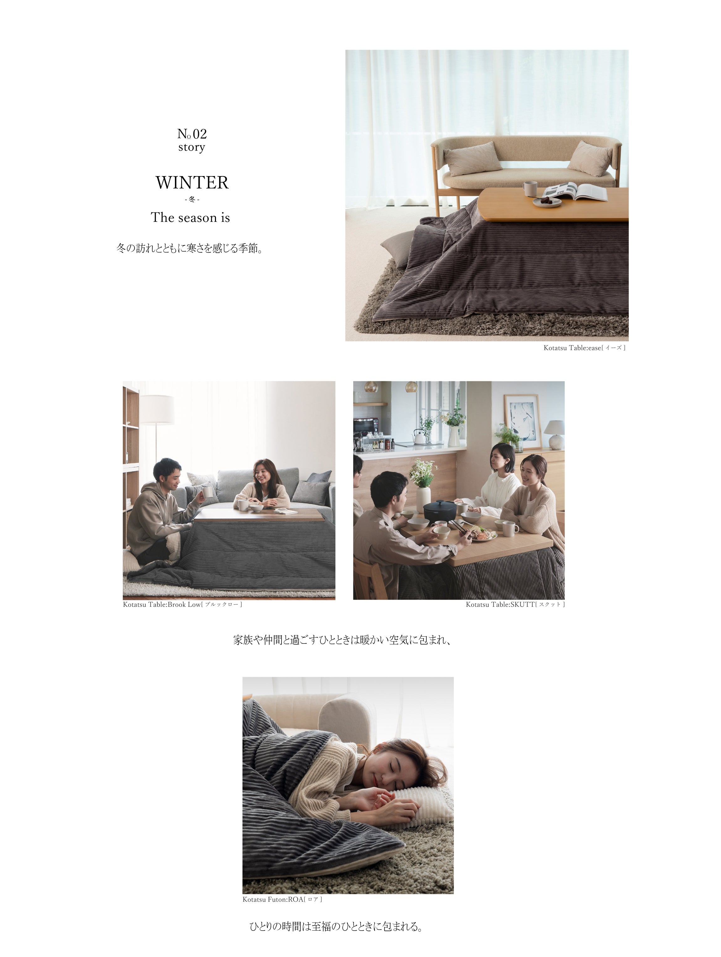 秋冬はこたつとして、春夏はテーブルとしてリビングやダイニングを彩るバリエーション豊かなこたつテーブルを取り揃えています。
