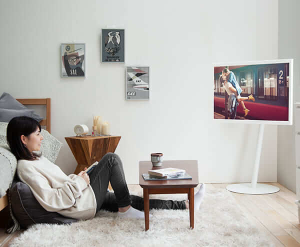 没入感を追求して辿り着いた 独自開発の「7の字フレーム」。 支柱とテレビの距離を離すことで画面が宙に浮いているように見える、独自の「7の字フレーム」を採用。映像の世界に浸り切れる、没入感の高い視聴体験を実現できます。 -