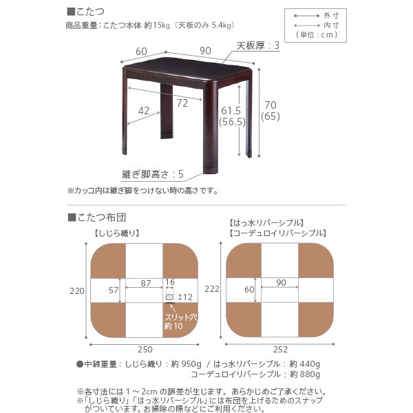 | こたつ本体 | 天板:繊維板(転写プリント) 脚部:天然木(ラバーウッド) 塗装:ウレタン樹脂塗装 薄型石英管ヒーター(500W・中間スイッチ式) コード長さ:約3m ◎一部組立(脚部取付) |