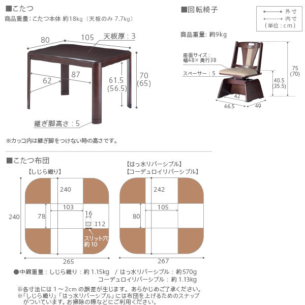 | こたつ本体 | 天板:繊維板(転写プリント) 脚部:天然木(ラバーウッド) 塗装:ウレタン樹脂塗装 薄型石英管ヒーター(500W・中間スイッチ式) コード長さ:約3m ◎一部組立(脚部取付) |