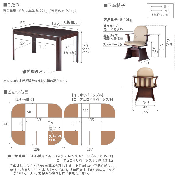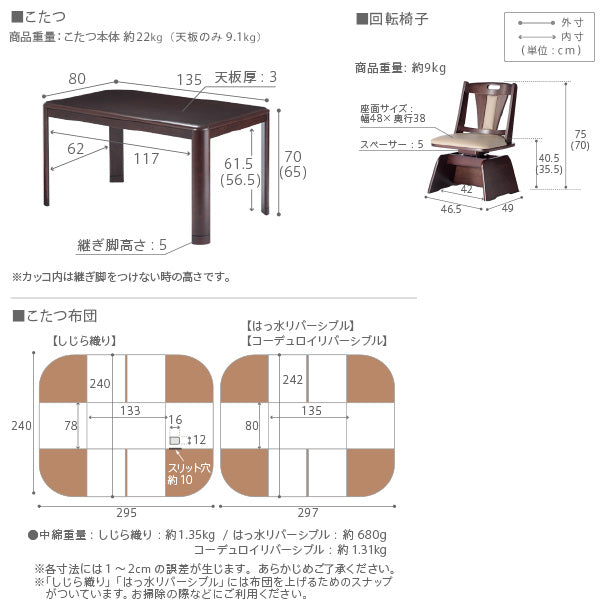 | こたつ本体 | 天板:繊維板(転写プリント) 脚部:天然木(ラバーウッド) 塗装:ウレタン樹脂塗装 薄型石英管ヒーター(500W・中間スイッチ式) コード長さ:約3m ◎一部組立(脚部取付) |
