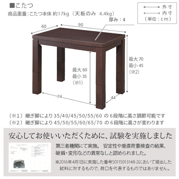| こたつ本体 | 天板:繊維板(転写プリント) 脚部:天然木(ラバーウッド) 塗装:ウレタン樹脂塗装 薄型石英管ヒーター(500W・中間スイッチ式) コード長さ:約3m ◎一部組立(脚部取付) |