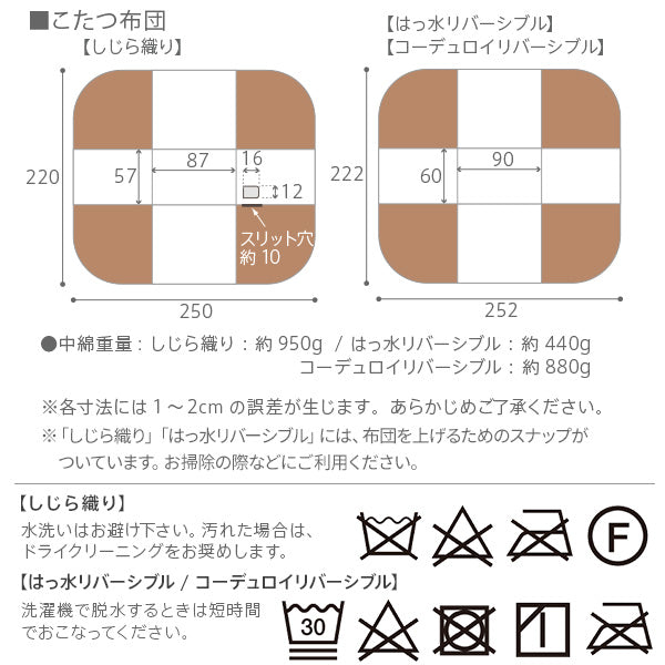 | コーデュロイリバーシブルこたつ布団 | 表地:ポリエステル100%(コーデュロイ) 裏地:ポリエステル100%(コーデュロイ) 中綿:ポリエステル100%(ポリエステル綿68%・サラウォーム保温綿32%) |