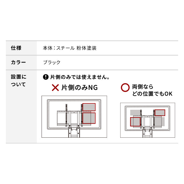 壁寄せタイプのテレビスタンドは、壁掛けと同様の効果を得るため、出来る限りテレビを壁に近づけられるよう設計されています。後ろ方向への安全性を確保するために、壁に寄せて設置する必要があります。