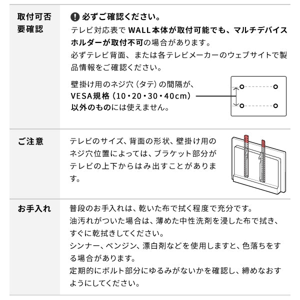 そのため、耐荷重内の重さでも規定の対応テレビサイズより大きいテレビは取り付けをお勧めしていません。 取り付けの確認はテレビ対応表をご確認ください。