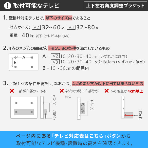そのため、耐荷重内の重さでも規定の対応テレビサイズより大きいテレビは取り付けをお勧めしていません。 取り付けの確認はテレビ対応表をご確認ください。