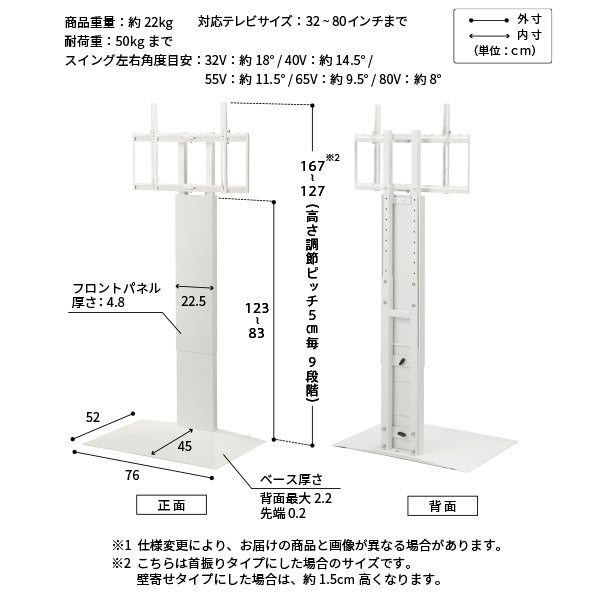| サイズ | 対応テレビサイズ:32~80インチ(50kg)まで 幅76x奥行52x高さ127〜167cm 重量:約22kg 高さ調節ピッチ:5cm(5段階) スイング左右角度目安:32V 約18° /40V 約14.5° /55V 約11.5° /65V 約9.5° /80V 約8° / ベースサイズ:幅76x奥行52(45)cm・厚み0.2~2.2mm |