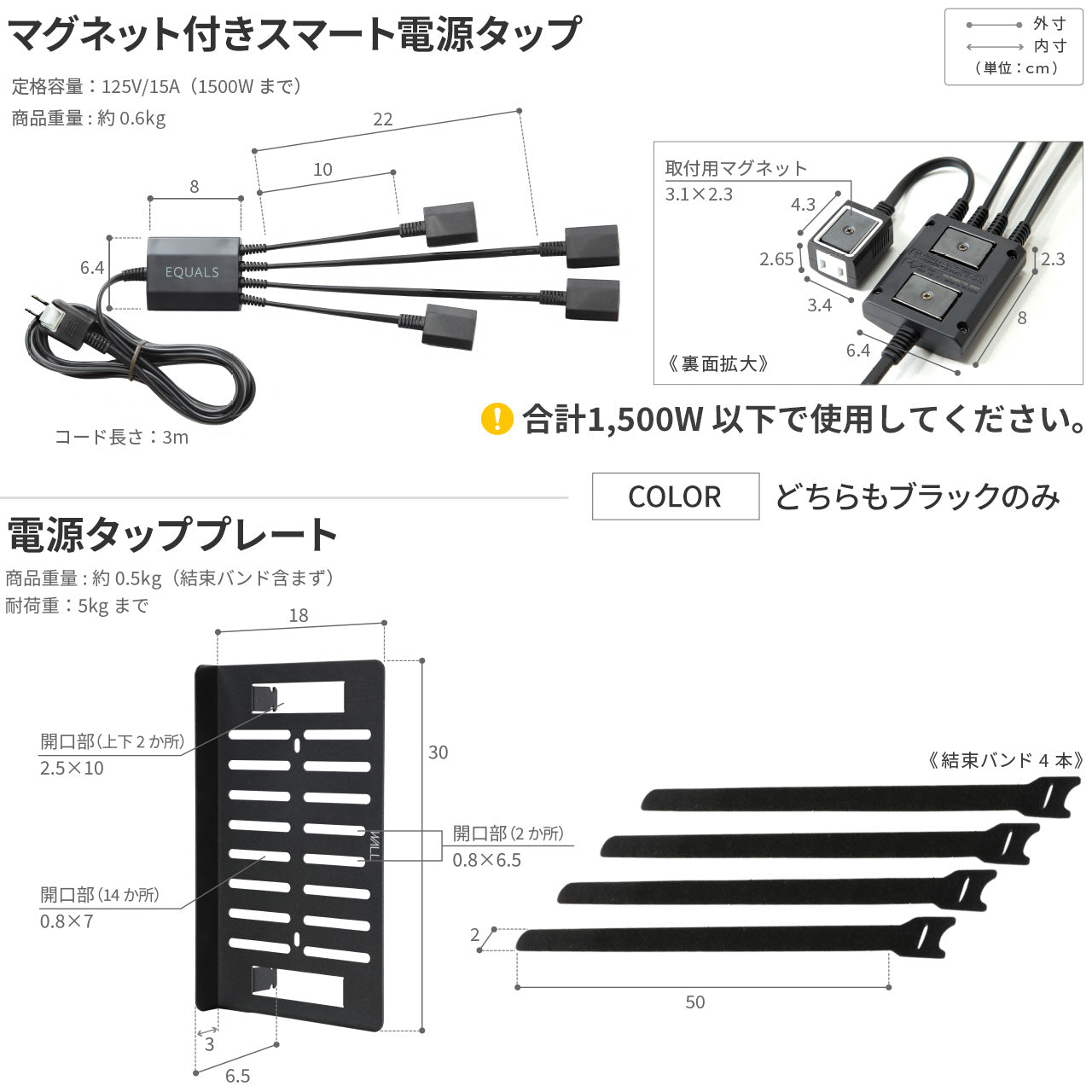 サイズ | ■マグネット付きスマート電源タップ 定格容量:125V/15A(1500Wまで) 商品重量:約0.6kg ボディサイズ(コード根元含まず):幅6.4x奥行8x高さ2.3cm コンセント部サイズ:幅3.4x奥行4.3x高さ2.65cm コード長さ:3m ■電源タッププレート 幅18x高さ30x奥行6.5cm 重量:約0.5kg 耐荷重:5kg ■結束バンド 幅2x長さ50cmx4本 |